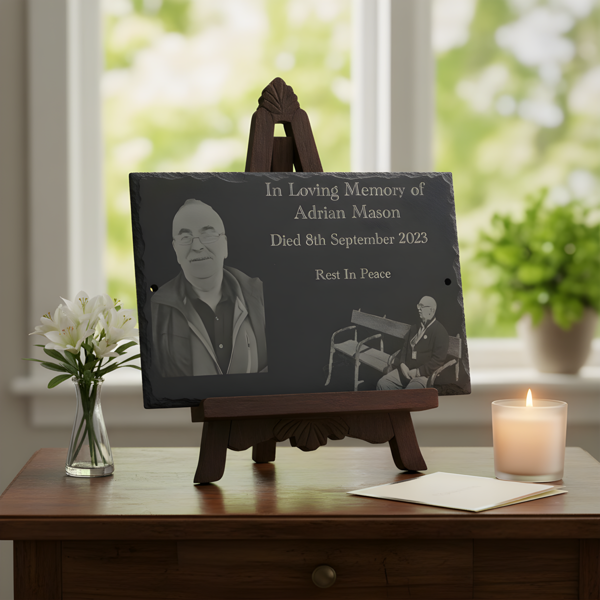Custom engraved with names, dates, or a special message, each piece becomes a unique tribute that can be cherished for years. The natural texture of slate adds a timeless, understated feel, making it a respectful and elegant remembrance piece.