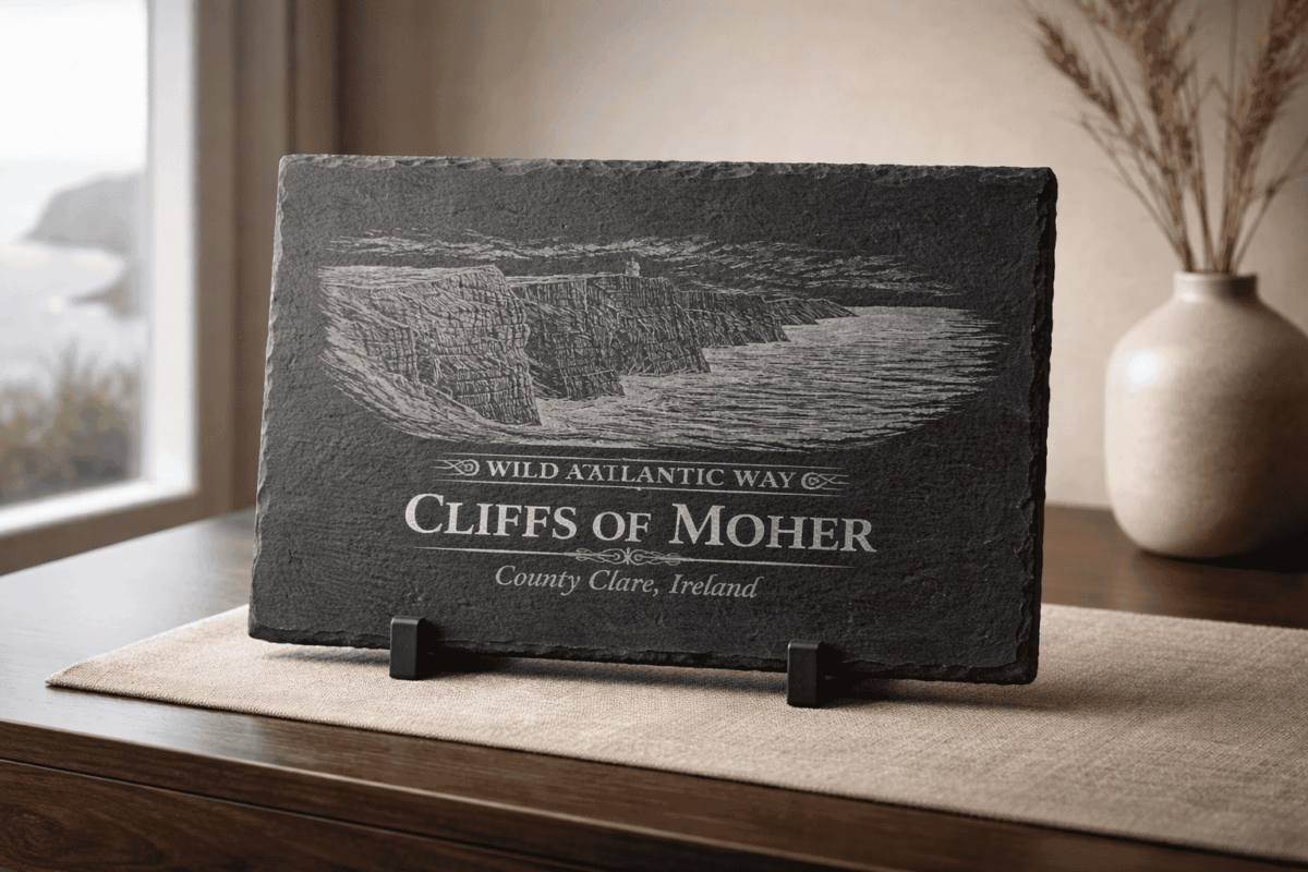 A handcrafted Cliffs of Moher slate plaque captures this breathtaking coastline in engraved detail, creating a beautiful decorative piece that celebrates Ireland’s natural heritage.