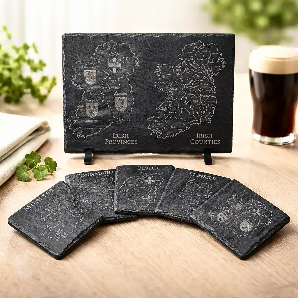 Each coaster showcases the historic provinces of Ireland engraved into durable natural slate. This makes them both a decorative conversation piece and a practical addition to any coffee table.