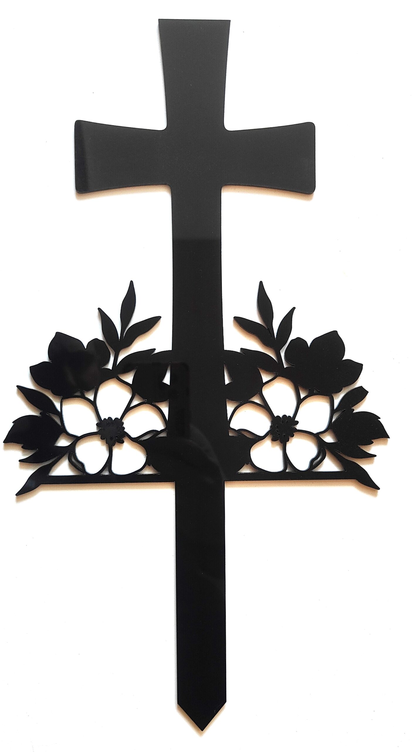 This grave marker features a symbolic cross design with intricate flower detailing, offering a meaningful tribute to loved ones. Crafted from 3mm durable acrylic, it is designed to withstand various weather conditions while maintaining its elegant appearance. A timeless and respectful memorial piece for honoring cherished memories.