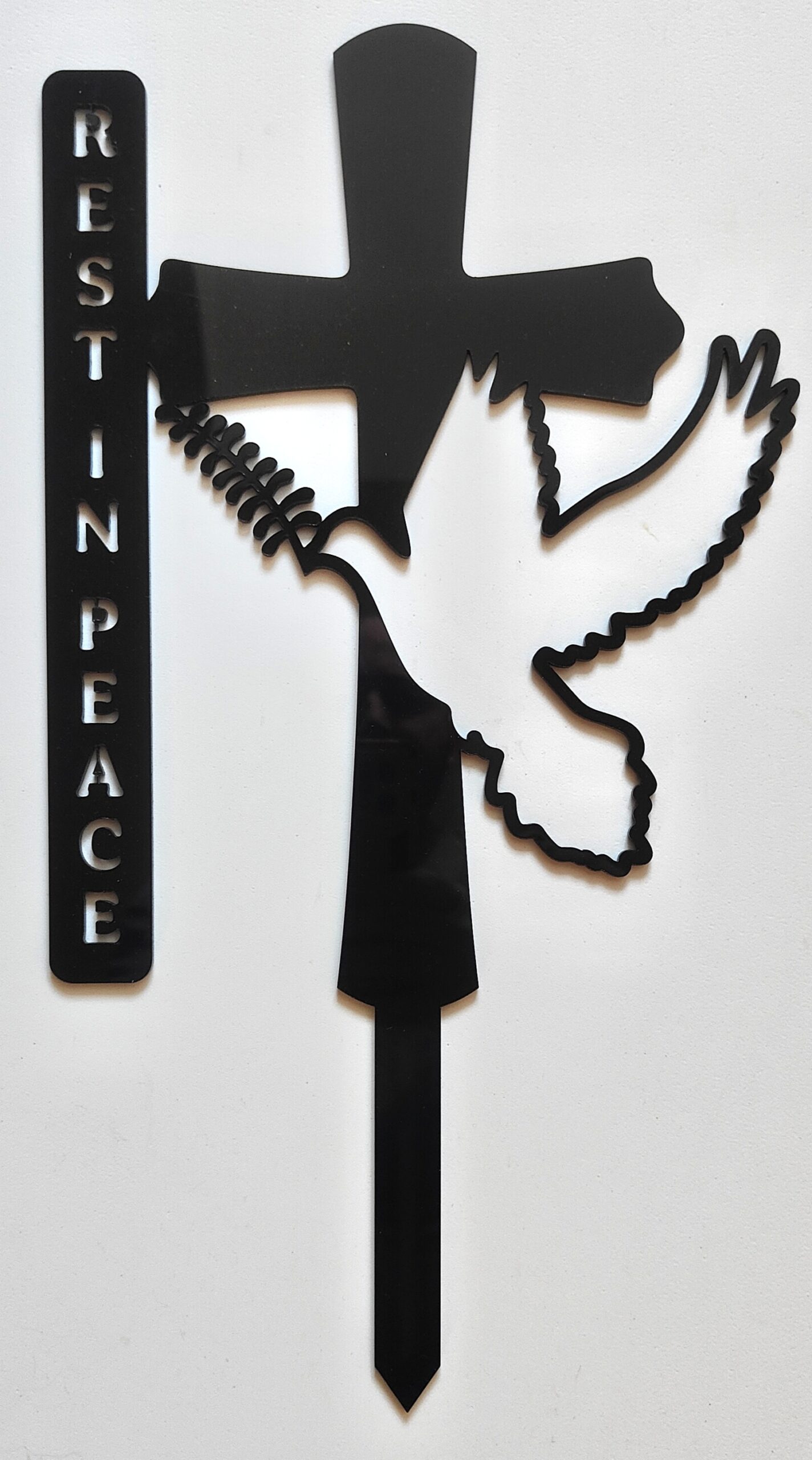 This grave marker features a peaceful design with the words ‘Rest in Peace’ accompanied by a dove motif, symbolizing serenity and remembrance. Crafted from durable 3mm acrylic, it is lightweight yet sturdy, ensuring lasting quality. Its simple yet elegant design offers a respectful tribute to honor a loved one.