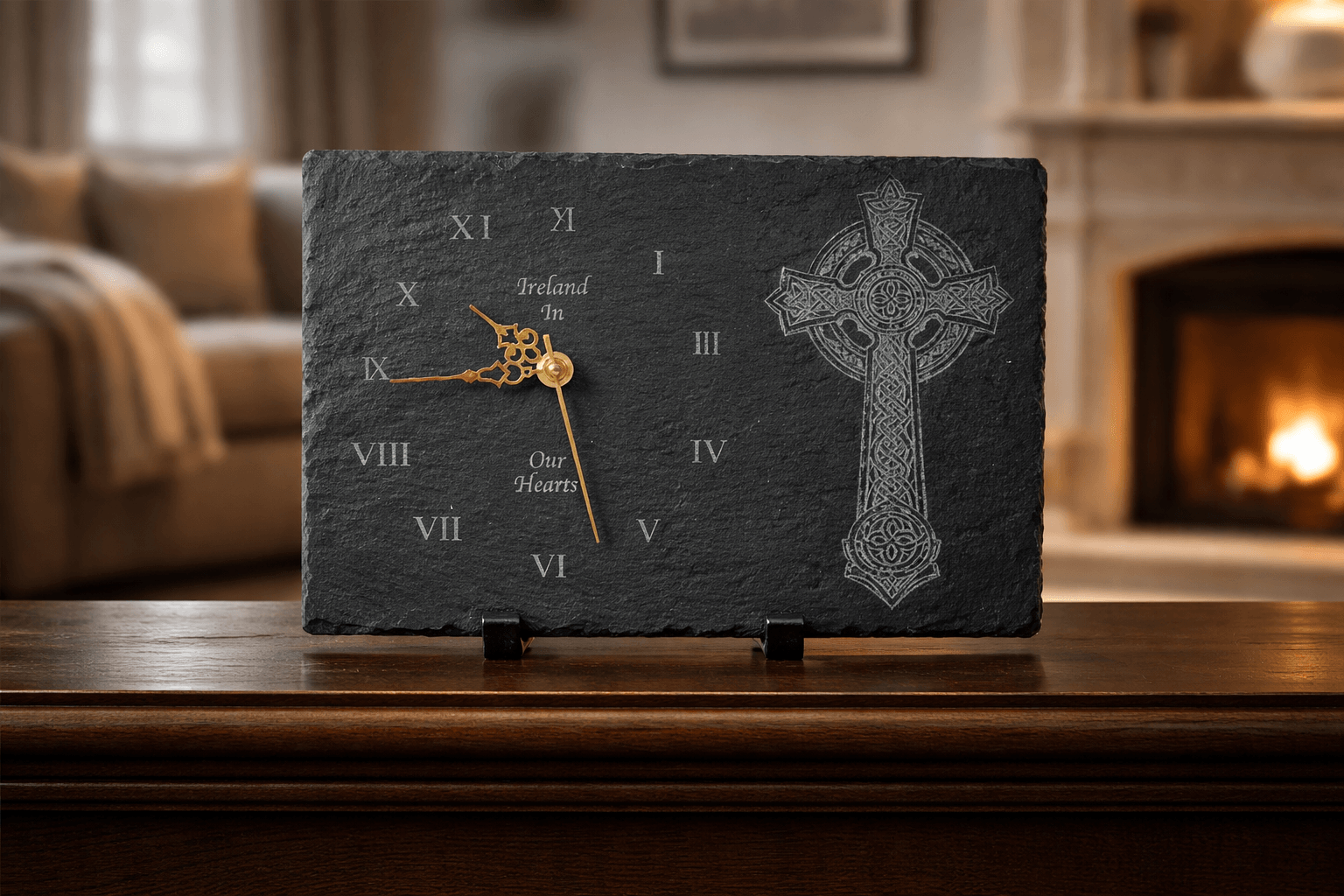 Bring a sense of heritage and meaning into your home with this beautifully crafted Irish slate clock. Featuring an intricately engraved Celtic cross and classic Roman numerals, this timeless piece blends traditional Irish symbolism with modern craftsmanship.