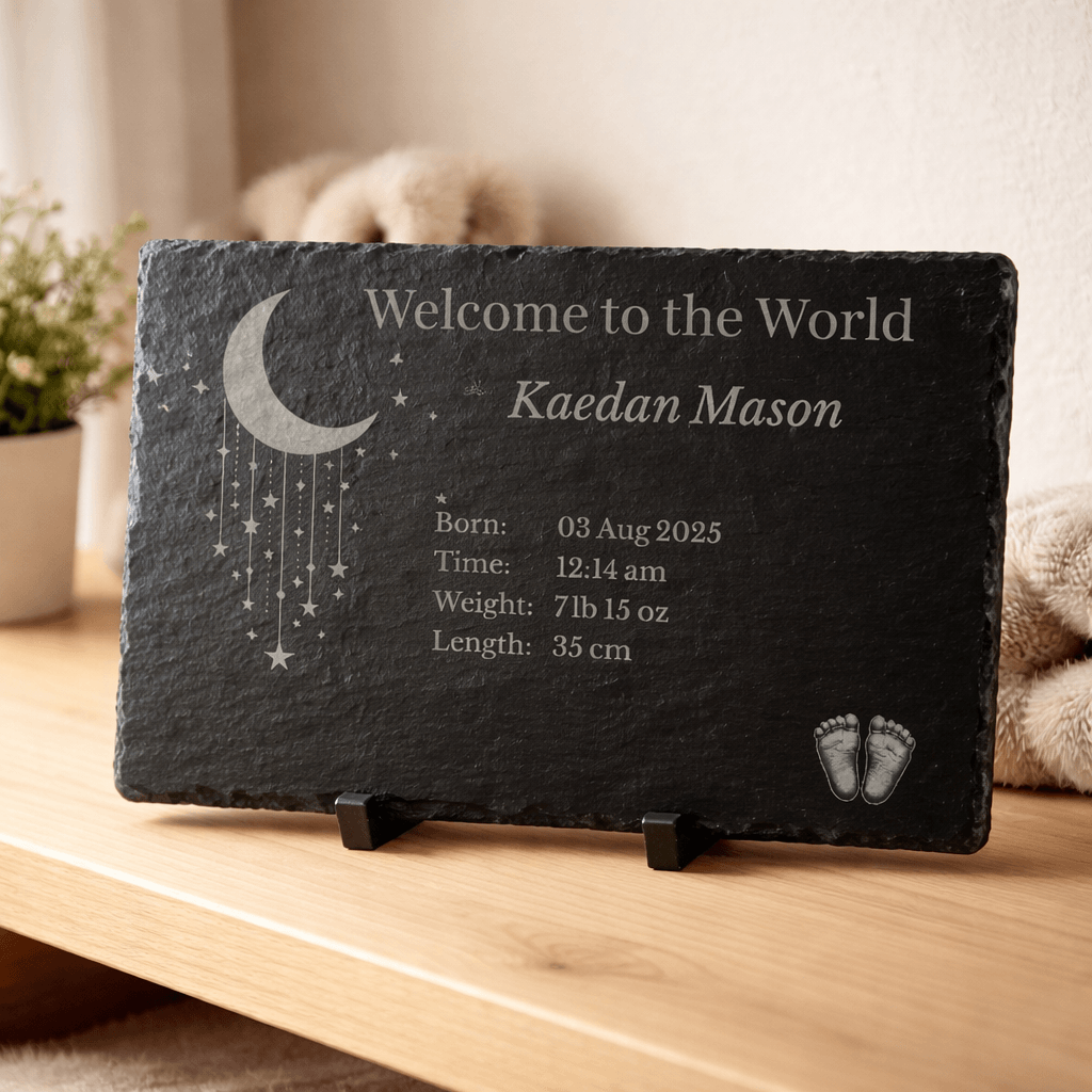 Celebrate the arrival of a newborn with a beautifully crafted, personalised keepsake bundle designed to last a lifetime. This elegant Welcome Baby set includes a natural slate plaque and two matching coasters, each custom engraved with your baby’s most precious details.