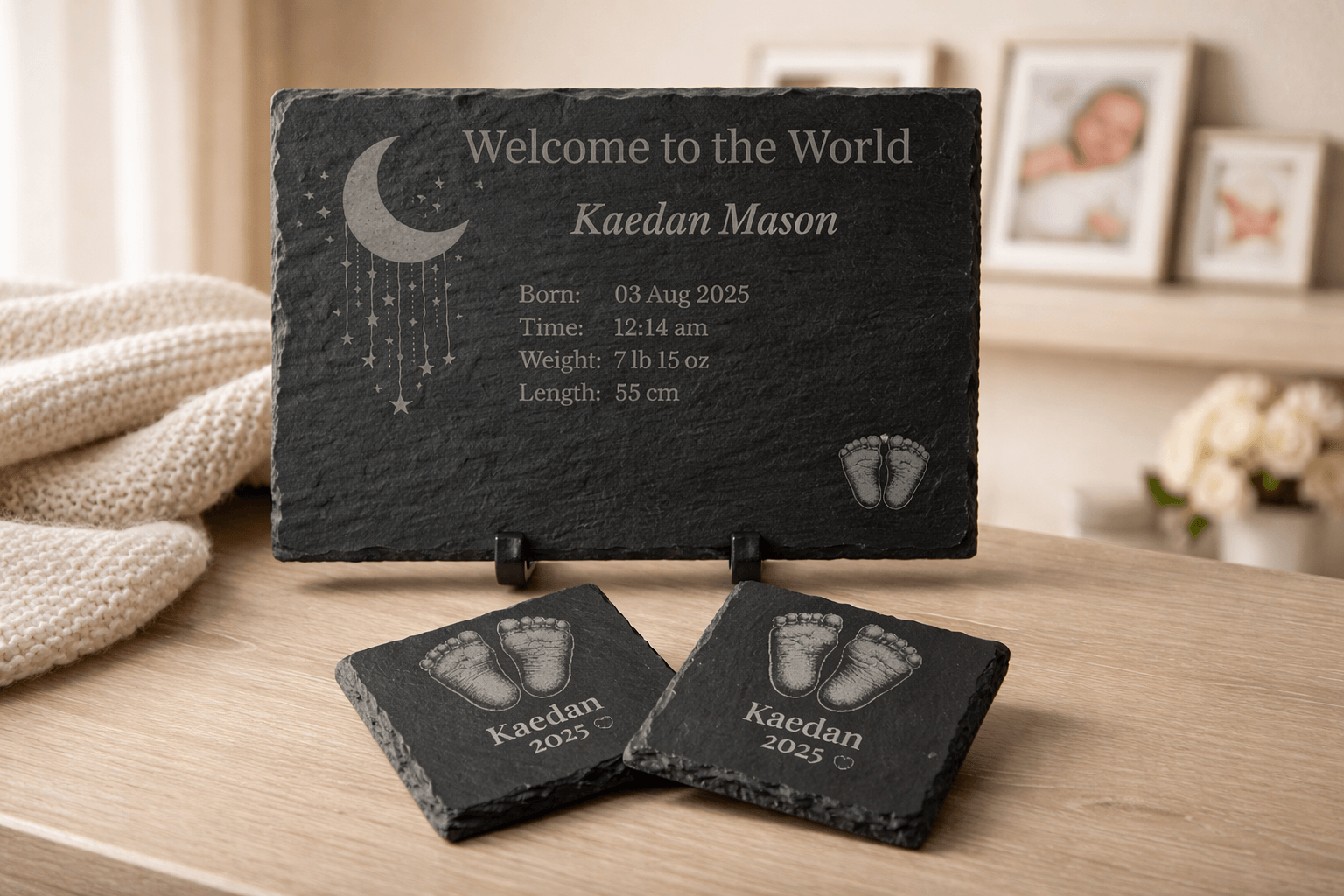 Personalised Newborn Keepsake Bundle – Slate Plaque & Matching Coasters