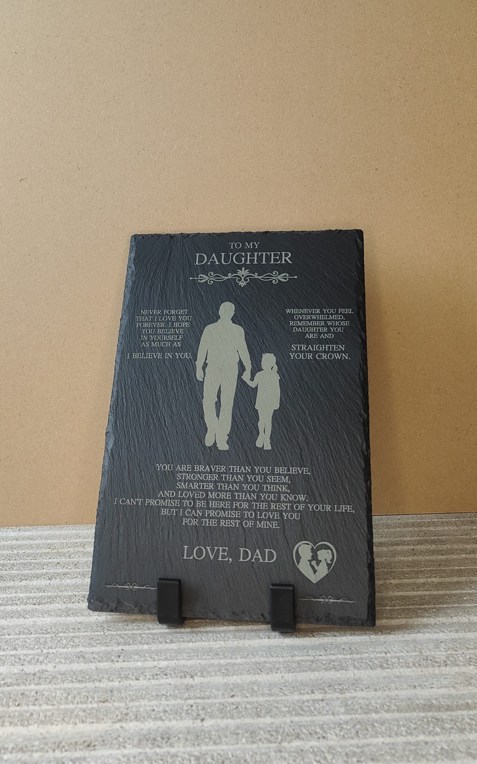 This ‘To My Daughter’ plaque is a meaningful keepsake, crafted from natural slate to provide a rustic and timeless aesthetic. Featuring a heartfelt message from a father to his daughter, it delivers fatherly advice and expresses enduring love in an elegant and thoughtful design. The sturdy slate material ensures durability, making it a long-lasting reminder of a father’s care and guidance. Perfect for gifting on special occasions or simply as a sentimental gesture, this plaque is a beautiful way to celebrate the bond between father and daughter. Its compact size and natural texture make it a versatile piece for display in any home decor setting.