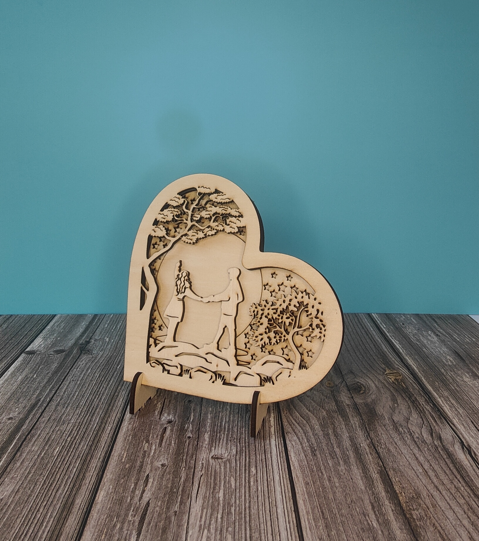 This layered heart design is crafted from precision-cut wood, creating a charming and meaningful piece perfect for couples or as a symbol of love. Its intricate detailing adds a touch of elegance to any space.