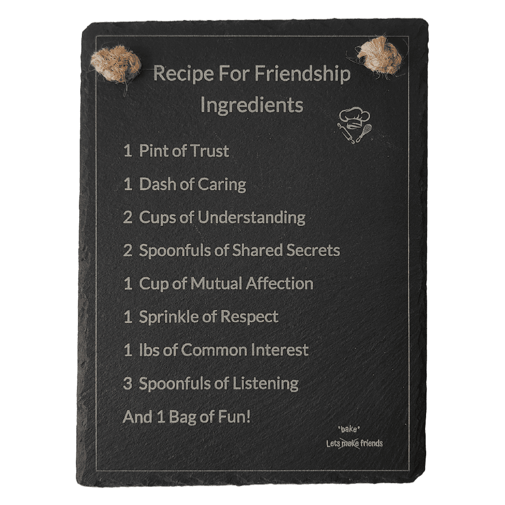 The ‘Recipe for Friendship’ is a decorative piece crafted from natural slate, offering a timeless and durable design. Featuring an engraved recipe-style inscription, it highlights the key ingredients needed to foster meaningful connections, making it an ideal addition to any home or office space. The slate comes with pre-drilled holes for easy hanging, ensuring seamless integration into your décor. Its thoughtful design makes it a perfect gift for friends or loved ones, emphasizing the importance of fun, trust, and togetherness. This piece combines functionality and sentiment, making it a memorable keepsake for any occasion.