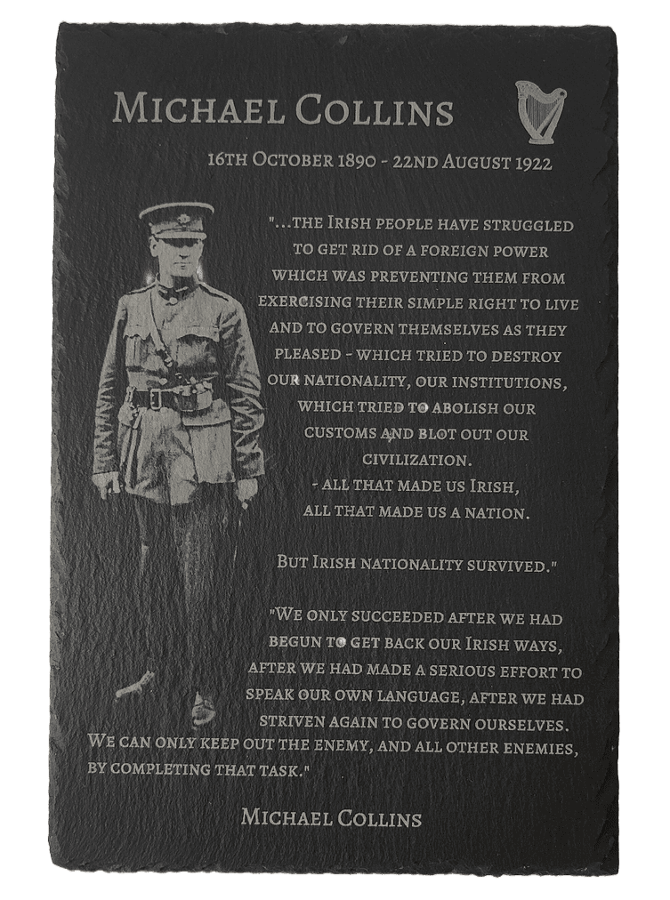 Celebrate one of Ireland’s most iconic and influential figures with this handcrafted Michael Collins slate piece. A central leader in Ireland’s fight for independence, Michael Collins played a pivotal role as Director of Intelligence for the IRA and later as Chairman of the Provisional Government during the formation of the Irish Free State.