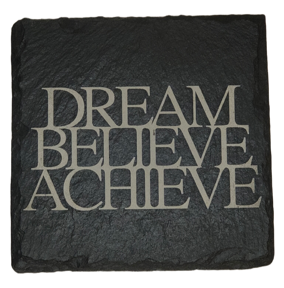 The Dream Believe Achieve Set includes inspirational content and motivational tools, complete with a premium slate coaster to keep you focused on your goals. Perfect for fostering positivity and achieving success in any setting.