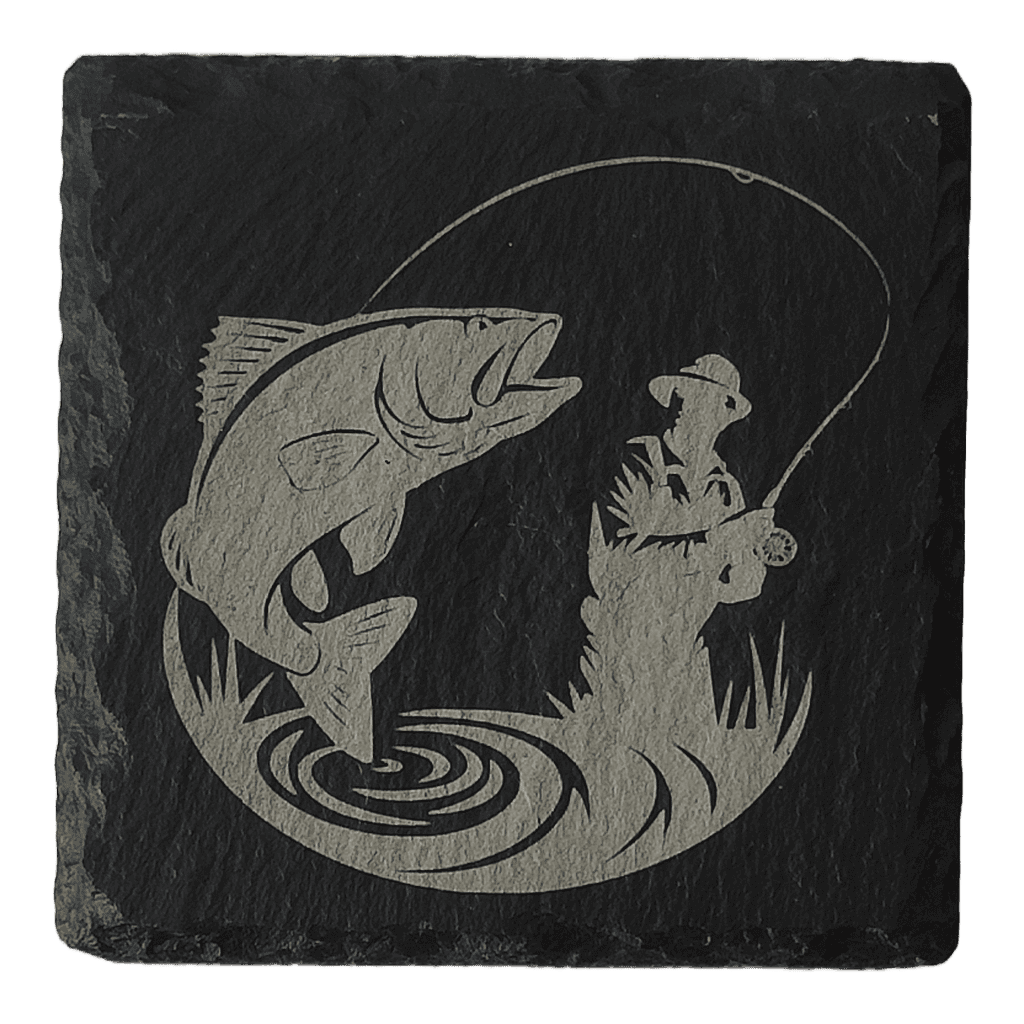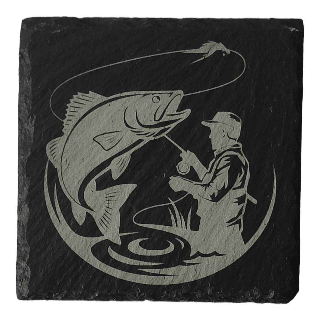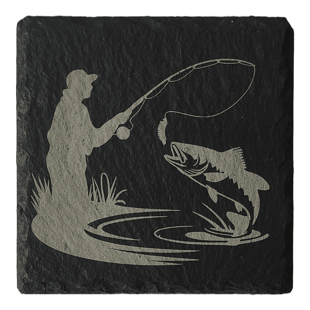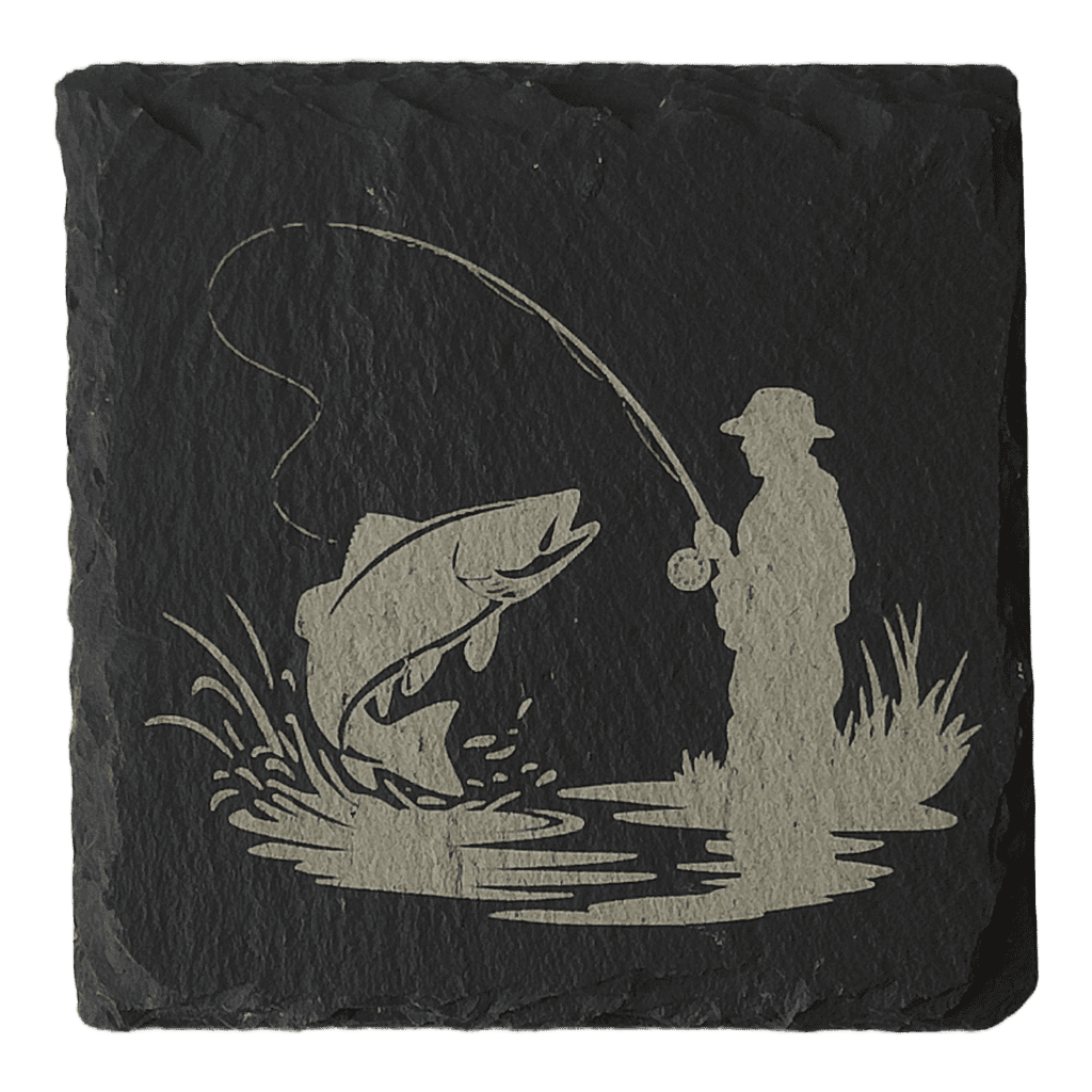 The Fly Fishing Set includes natural slate coasters with a rustic design, perfect for anglers and outdoor enthusiasts. Durable and stylish, these coasters are a practical addition to any home or fishing lodge.
