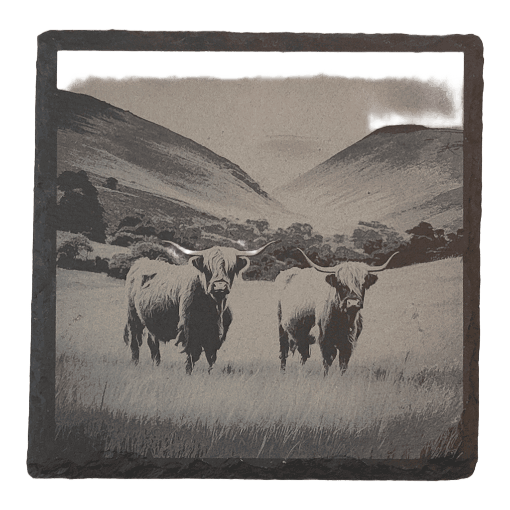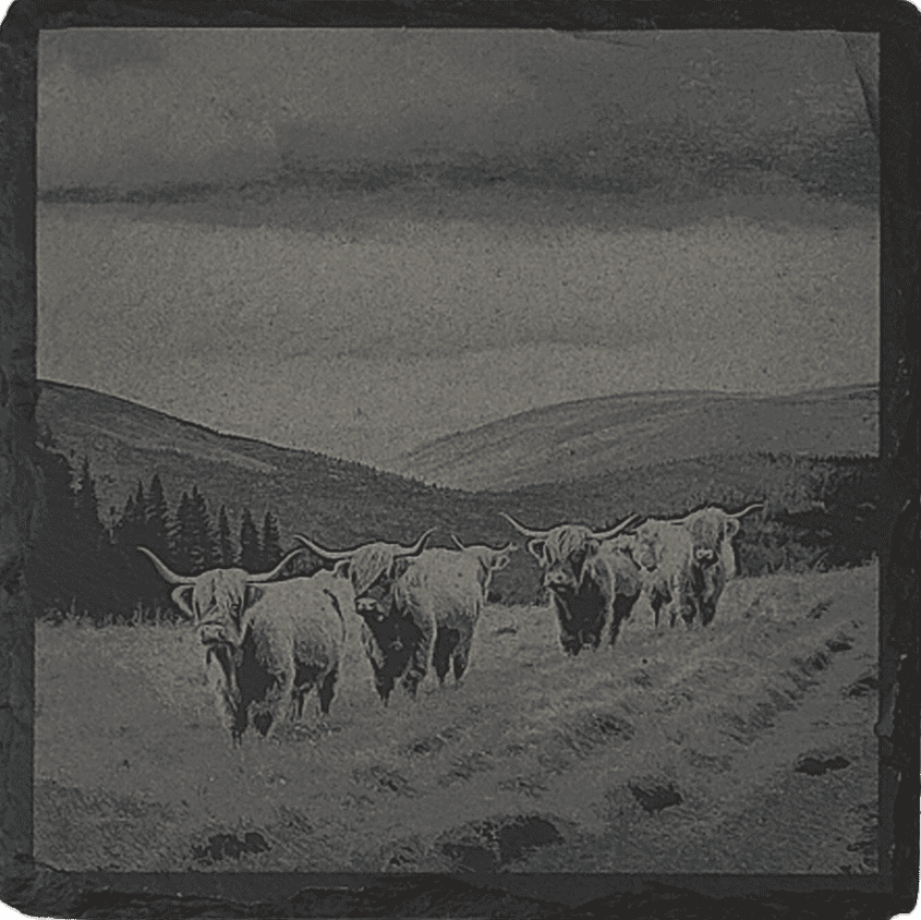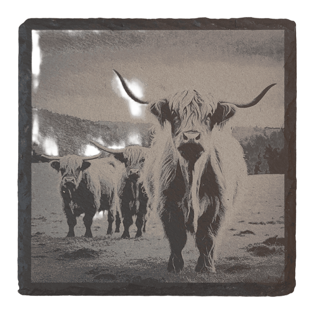 The Highland Cow Set 1 features an adorable design etched onto natural slate, adding a touch of charm to any home decor. Durable and stylish, this set is ideal for enhancing your living space with a rustic aesthetic.