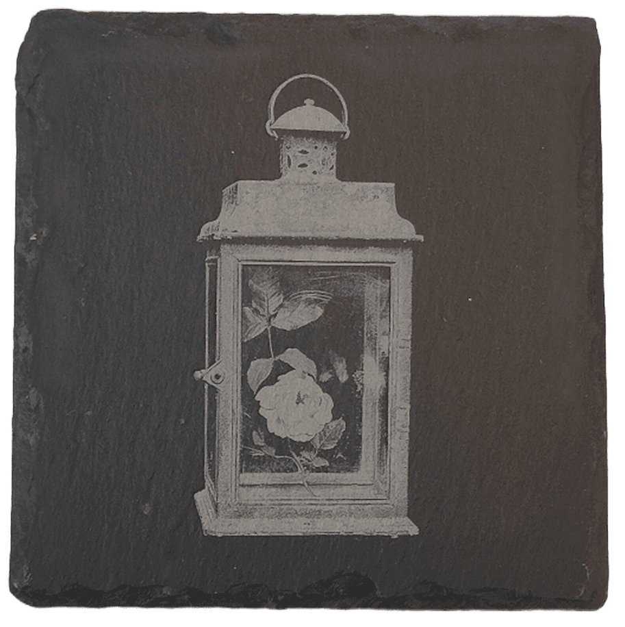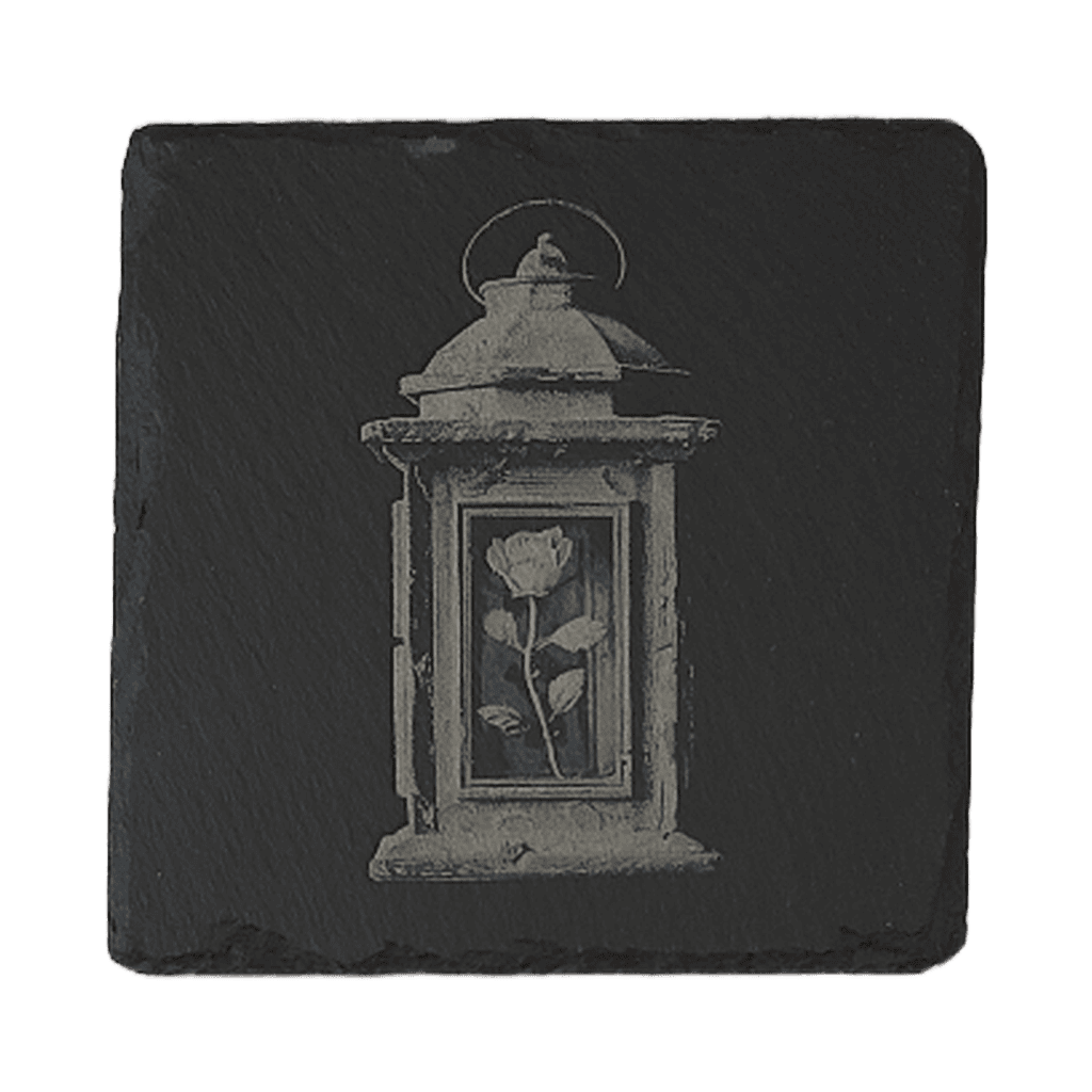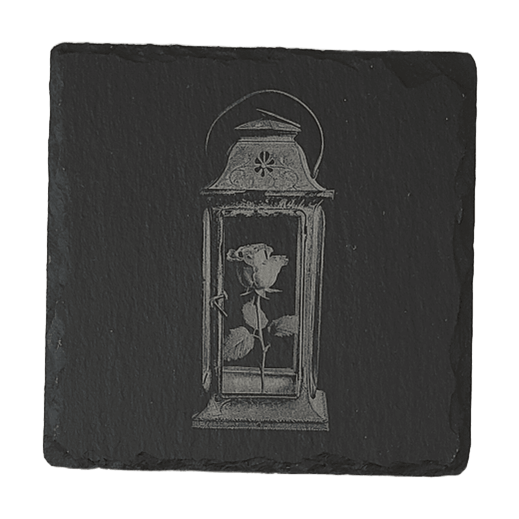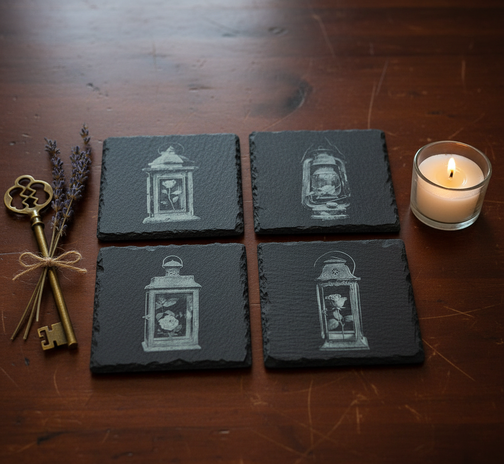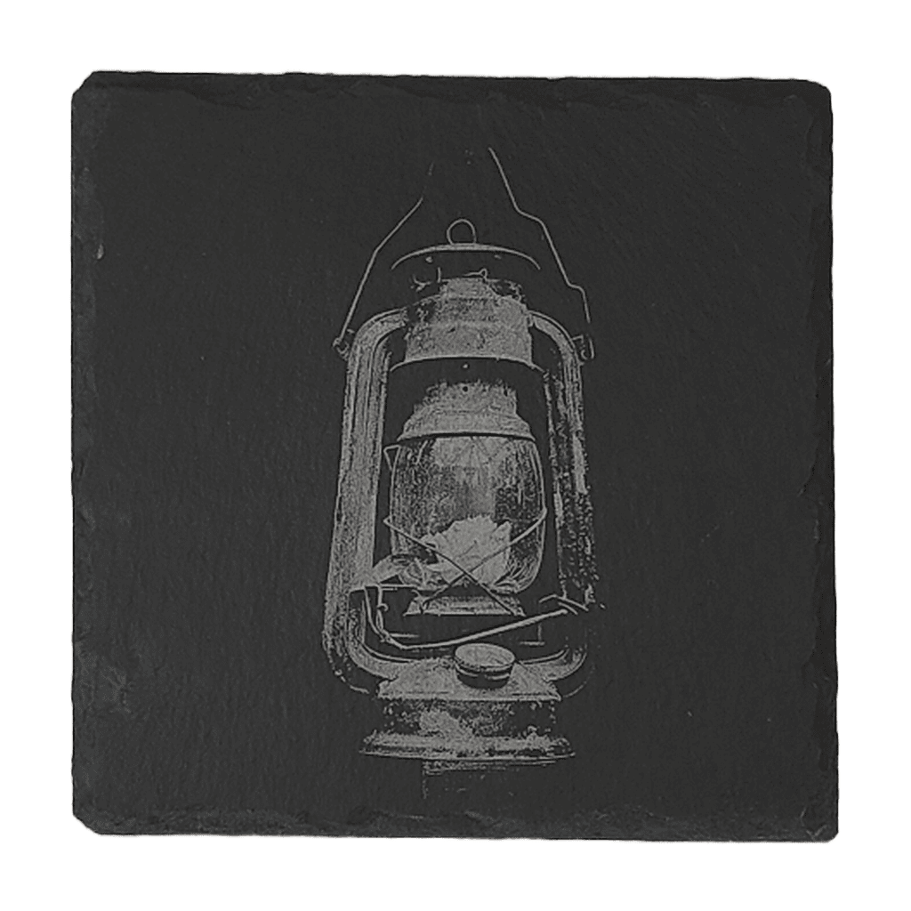 The Oil Lantern Coaster Set features a set of natural slate coasters designed with intricate oil lantern motifs, blending functionality with vintage-inspired aesthetics.