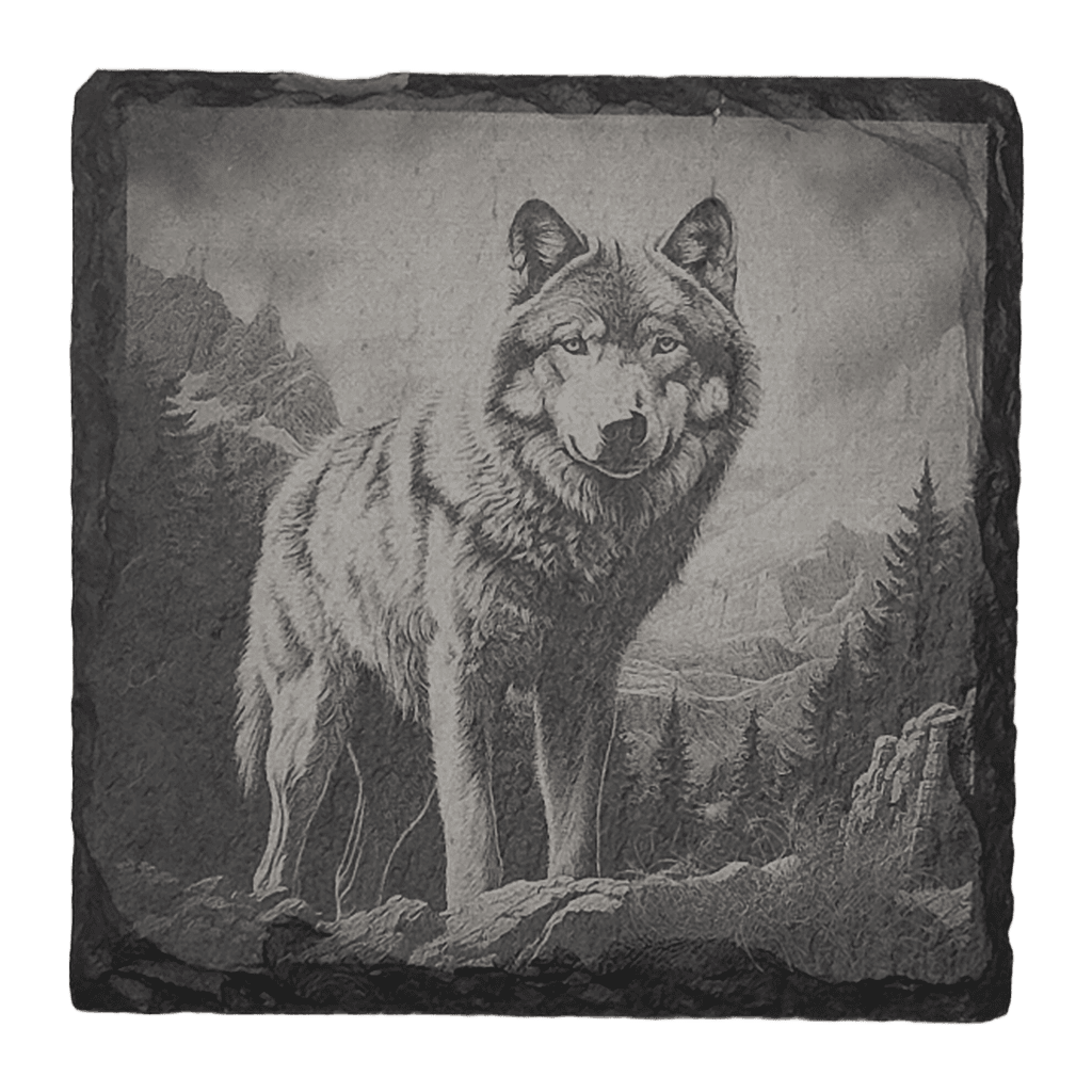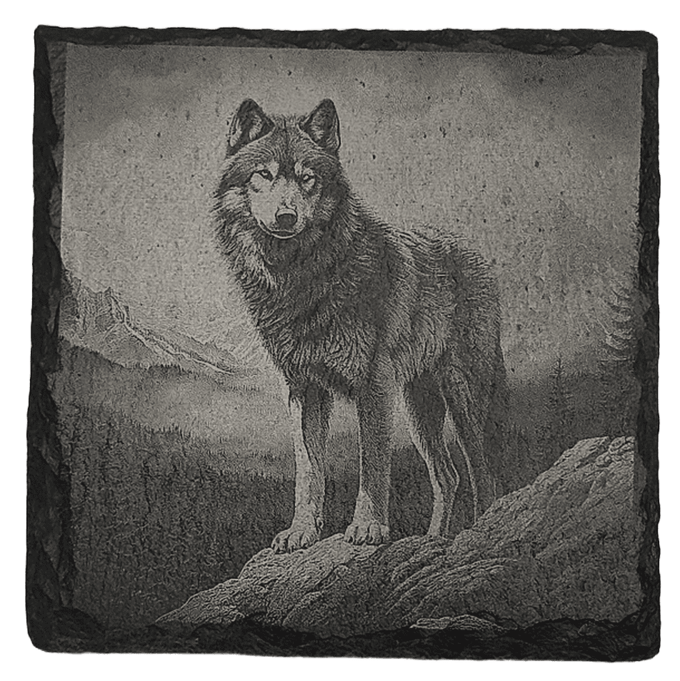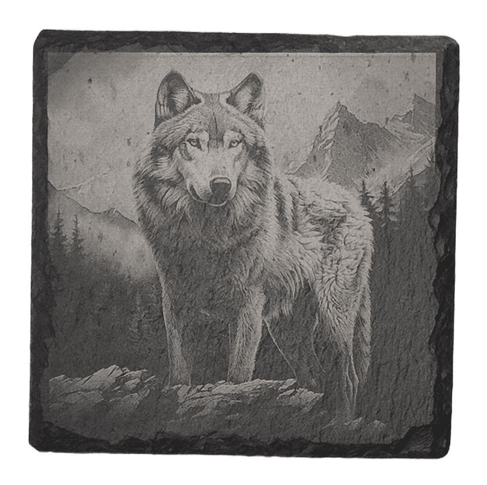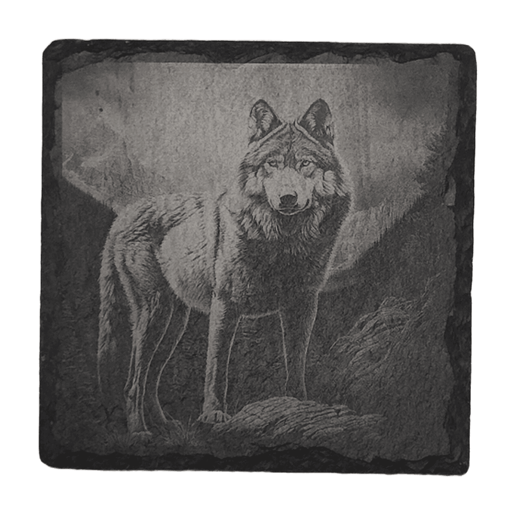 Intricately designed wolf illustrations on premium natural slate coasters.