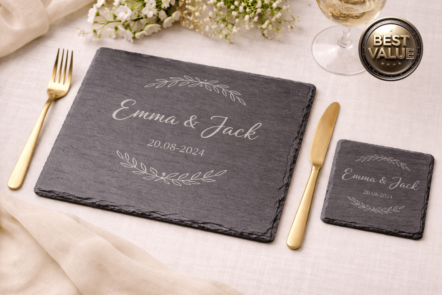 Create a beautifully coordinated wedding table setting with our personalised slate placemat and coaster bundle, custom engraved with your names and wedding date.