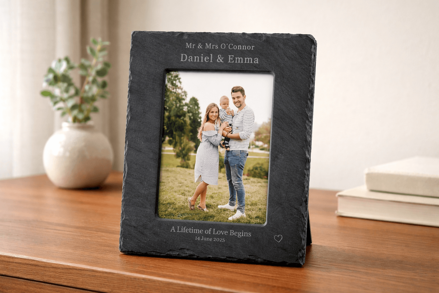 Perfect as a wedding gift for couples, anniversaries, or a thoughtful present from family and friends, this engraved slate frame combines timeless design with a premium, modern finish.